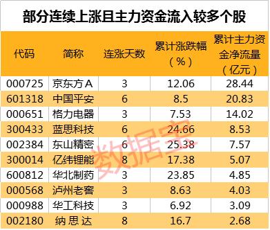 值得注意的是,261只连续上涨个股中,24只个股期间主力资金累计净流入超过亿元。其中,累计资金流入最多的为京东方A,主力资金累计流入28.44亿元。