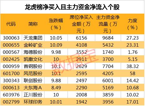 从盘口资金流向来看,主力资金净流入超千万且龙虎榜净买入个股共有12只,其中天龙集团、首钢股份(000959)、联创股份(300343)等个股资金净流入金额最大。净流入力度最大的个股有川能动力(000155)、荣丰控股(000668)、风范股份(601700),净流入力度分别为94.31%、71.61%、58%。