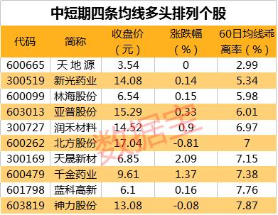 截至最新收盘,164只个股5日、10日、20日、60日四条均线近日呈多头排列。其中天地源(600665)、新光药业(300519)、林海股份(600099)股价与60日均线的乖离率最小,分别为2.99%、5.34%、5.98%。