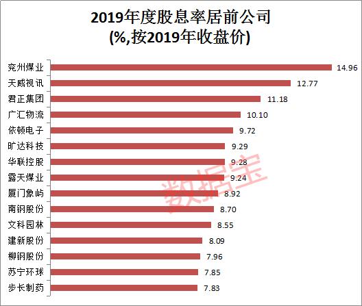 具体来看,兖州煤业(600188)股息率最高,达到14.96%,2019年度公司分配方案为10派5.8元,公司2019年度净利润86.68亿元,同比增长9.6%;天威视讯(002238)股息率次之,2019年度公司分配方案为10转增3派10元(含税),股息率高达12.77%,公司2019年度实现净利润1.88亿元,同比下降4.49%;紧跟其后的君正集团(601216),公司2019年度实现净利润24.92亿元,同比增长9.06%,分配方案为10派3.5元(含税),股息率达11.18%;另外广汇物流(600603)股息率也超过了10%。