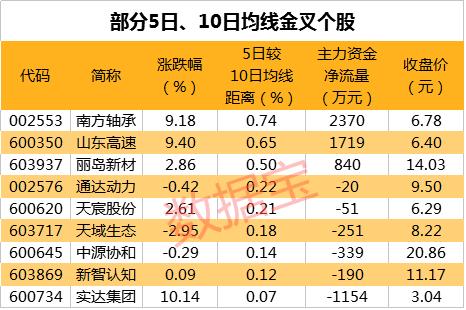 最新收盘显示,有11只A股的5日均线主动上穿10日均线,其中南方轴承(002553)、山东高速(600350)、丽岛新材(603937)等个股的5日均线较10日均线距离最大,分别达0.74%、0.65%、0.50%。