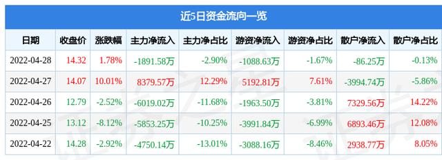 资金流向数据方面,4月28日主力资金净流出1891.58万元,游资资金净流出1088.63万元,散户资金净流出86.25万元。