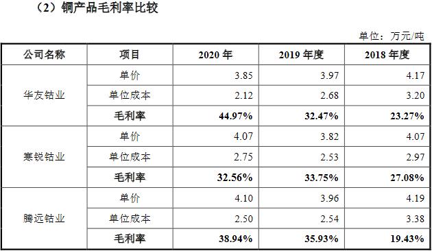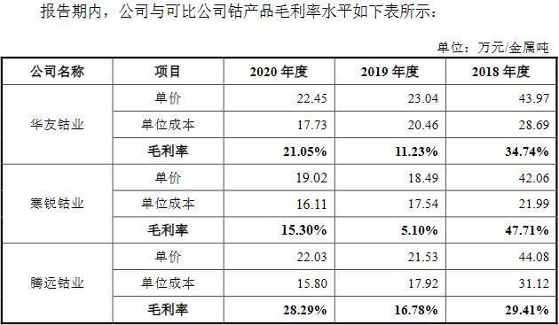 2018年至2020年,同行业可比公司华友钴业毛利率分别为28.56%、10.68%和14.75%,寒锐钴业毛利率分比为45.33%、11.77%和23.84%。也就是说,2019年和2020年,腾远钴业的毛利率均远高于同行龙头公司华友钴业和寒锐钴业。