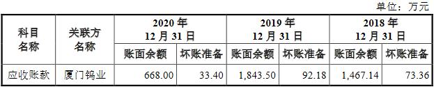腾远钴业招股说明书显示,公司在2018年末、2019年末及2020年末对厦门钨业存在应收款余额,金额分别是1467.14万元、1843.50万元及668.00万元。