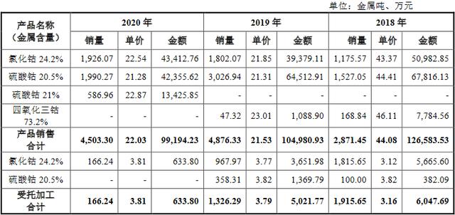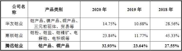 2018年至2020年,腾远钴业钴产品实现营业收入分别为12.66亿元、10.50亿元和9.92亿元,占该公司主营业务收入的比例分别为81.58%、62.97%和56.95%。