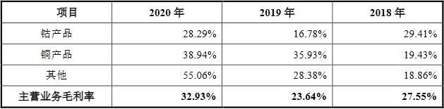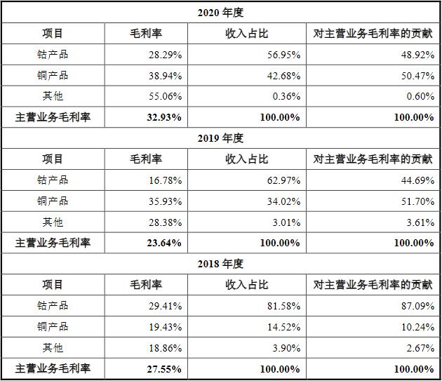 毛利率方面,2014年至2020年,腾远钴业主营业务毛利率分别为11.78%、10.77%、18.44%、39.28%、27.55%、23.64%和32.93%。