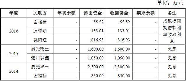2014年,腾远钴业向晨光稀土、谢福标分别拆出资金2300.00万元和850.00万元,并于同年收回资金,均为免息。其中,晨光稀土系曾受腾远钴业实际控制人之一的罗洁配偶黄平控制的公司。