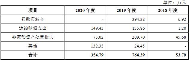 另据招股说明书,2017年至2020年,腾远钴业营业外支出分别为203.65万元、53.79万元、764.39万元和354.79万元,主要为固定资产处置损失、罚款滞纳金及违约赔偿支出。