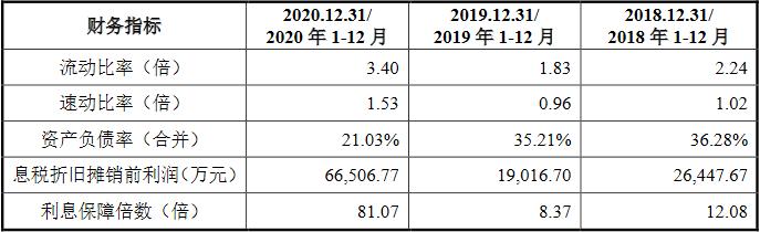 2014年至2020年,腾远钴业资产负债率(合并)分别为50.83%、29.11%、33.61%、46.29%、36.28%、35.21%和21.03%;流动比率分别为1.49、2.75、2.18、1.82、2.24、1.83和3.40;速动比率分别为0.83、1.91、1.17、0.68、1.02、0.96和1.53。
