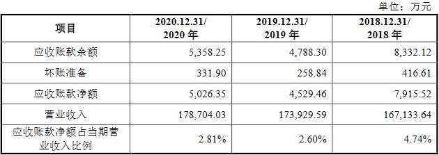 2014年至2020年各期末,腾远钴业应收账款余额分别为4170.76万元、6452.51万元、3207.85万元、4265.47万元、8332.12万元、4788.30万元和5358.25万元;坏账准备分别为208.54万元、322.63万元、160.39万元、213.27万元、416.61万元、258.84万元和331.90万元;应收账款净额分别为3962.22万元、6129.88万元、3047.46万元、4052.20万元、7915.52万元、4529.46万元和5026.35万元,占当期营业收入的比例分别为5.62%、10.86%、4.90%、2.40%、4.74%、2.60%和2.81%。