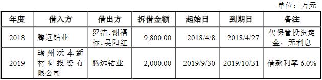 2019年9月30日,腾远钴业向赣州沃本新材料投资有限公司拆出资金2000.00万元,次月31日到期,借款利率6.0%。赣州沃本新材料投资有限公司为罗洁配偶黄平持股99%并担任其董事长。