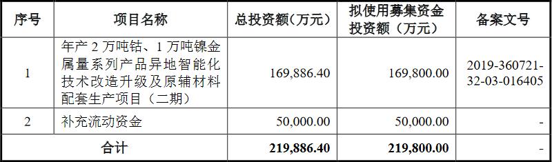 腾远钴业本次拟发行不超过3148.69万股,发行完成后公开发行股份数占发行后总股数的比例不低于25%,发行后总股本不超过12594.75万股。该公司拟募集资金21.98亿元,其中,16.98亿元拟用于年产2万吨钴、1万吨镍金属量系列产品异地智能化技术改造升级及原辅材料配套生产项目(二期),5.00亿元拟用于补充流动资金。