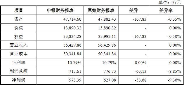 2015 年度原始财务报表与申报财务报表差异。申报财务报表根据公司2015年度确定的更为谨慎的应收款项坏账政策,将账龄为1年以内的应收款项坏账准备计提比例由原先的2%,改为5%。调整事项对2015年度财务数据影响不大,2015年度原始报表与申报报表差异比较表如下: