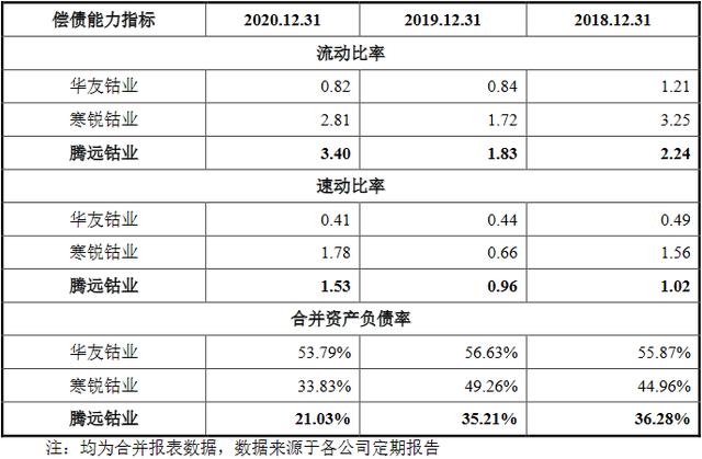 2014年至2020年,合并资产负债率上,华友钴业分别为71.06%、74.80%、58.77%、63.43%、55.87%、56.63%、53.79%,寒锐钴业分别为67.85%、63.70%、53.49%、48.76%、44.96%、49.26%和33.83%;流动比率上,华友钴业分别为0.86、0.81、1.00、1.09、1.21、0.84和0.82,寒锐钴业分别为1.14、1.19、1.36、2.08、3.25、1.72和2.81;速动比率上,华友钴业分别为0.37、0.40、0.64、0.54、0.49、0.44和0.41,寒锐钴业分别为0.52、0.49、0.61、1.04、1.56、0.66和1.78。