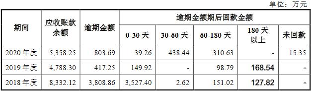 2018年至2020年,腾远钴业应收账款逾期金额分别为3808.86万元、417.25万元和803.69万元。其中,报告期内,逾期0-30天期后回款金额分别为3527.40万元、149.92万元和39.26万元,逾期30-60天期后回款金额分别为2.62万元、0元和438.44万元,逾期60-180天期后回款金额分别为151.02万元、98.79万元和310.63万元,逾期180天以上期后回款金额分别为127.82万元、168.54万元和0元。