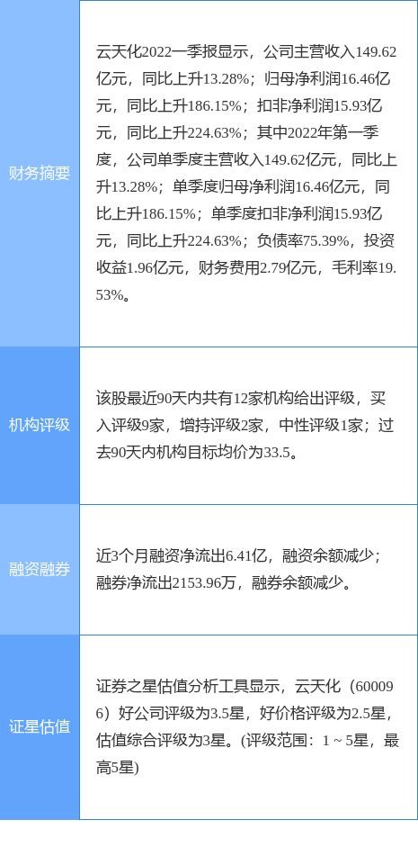 本文摘要:4月27日盘中消息,13点59分云天化(600096)封涨停板。目前价格22.28,上涨10.02%。其所属行业农化制品目前上涨。领涨股为川金诺。该股为氟化工,化肥,磷化工概念热股,当日氟化工概念上涨6.52%,化肥概念上涨5.47%,磷化… …