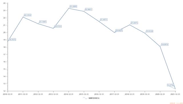 第一项异常数据体现在大幅下降的毛利率上。据年报显示,2021年立讯精密毛利率为12.28%,同比下滑5.81个百分点,创历史新低。这一下滑幅度十分惊人。要知道,虽然公司自2018年以来毛利率便呈逐年下滑态势,但此前下滑幅度均不超过2个百分点。
