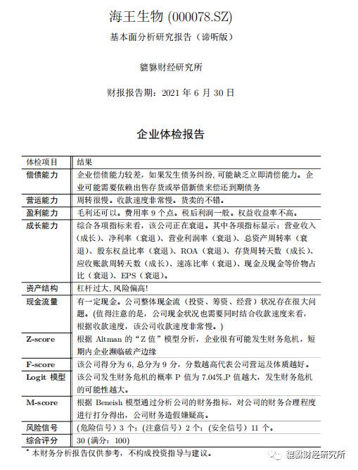 本文摘要:报告截至报告期:2021.06.30报告类别:价值基本面研究简报(谛听版),完整版可搜索公众号(貔貅财经研究所)下载。报告版本:谛听版『报告简要解读』海王生物(000078.SZ)近一年收益率长期跑输大盘。公司表现较差的方面主要为盈利能力、… …