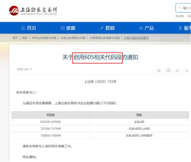 今年4月17日,上交所发布公告显示,启用605相关代码段,代码区间为“605000-605999”,主要用于主板A股。