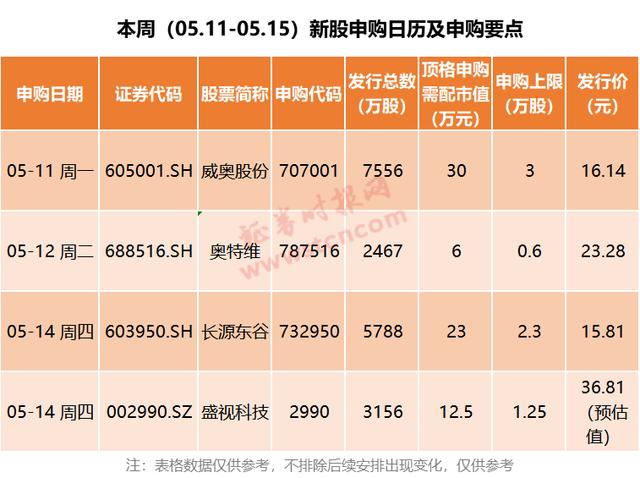 根据初步安排,本周(05.11-05.15)将迎来4只新股申购,其中主板新股有2只(威奥股份、长源东谷),中小板新股1只(盛视科技),科创板新股1只(奥特维)。