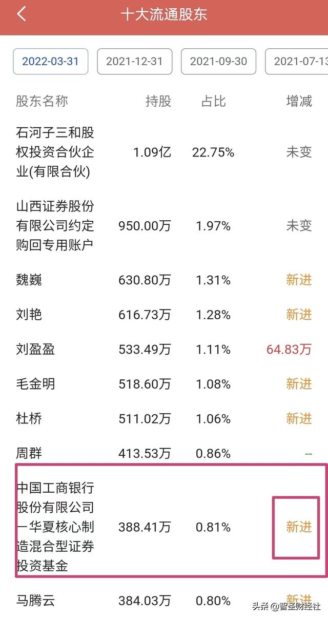 九安医疗2022年一季报显示,截止到3月底,华夏基金管理公司旗帜下华夏核心核心制造混合型基金赫然出现在前十大股东的阵营,持股388万股,市值接近3亿元。