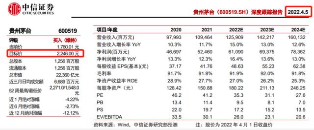 4月10日,中信证券研究部发布最新深度跟踪报告,其中悄然修正了对于贵州茅台的最新目标价——2246元/股。