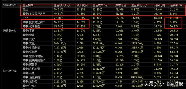 这个问题公司的主营业务构成可以告诉我们答案。2020年,医药商业业务为公司贡献了收入的70%左右,但是该业务的毛利率只有11.13%;化学制剂业务的毛利率大于50%,但是它给公司贡献的收入还不到15%。