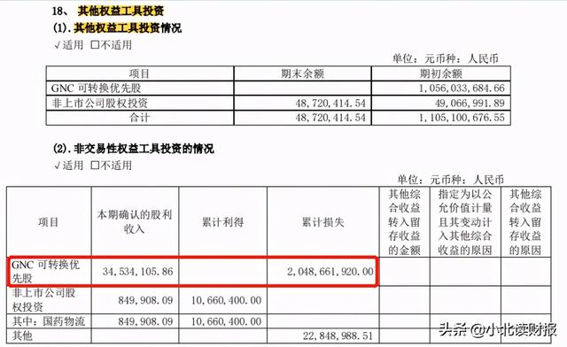 面对这笔失败的投资,哈药股份选择将其指定为以公允价值计量且其变动计入其他综合收益的金融资产,公司仅将GNC优先股股利计入了当期损益,而其他权益工具损失均计入了其他综合收益,其他综合收益账面金额为GNC可转换优先股公允价值与其报告期期末股价形成的差额(负的)。