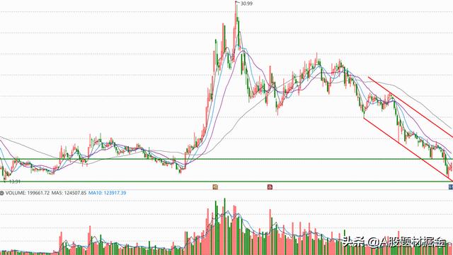 如上图所示,股价当前处在红色下降通道中运行,且近日股价到达通道下轨支撑线受到支撑并出现小幅反弹。我们根据当前走势图采取的材料是,在上图两条绿色水平线区间内进行逢低收集部分底仓筹码,然后等待股价上破红色通道上轨压力线再进行加仓操作。