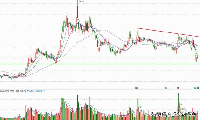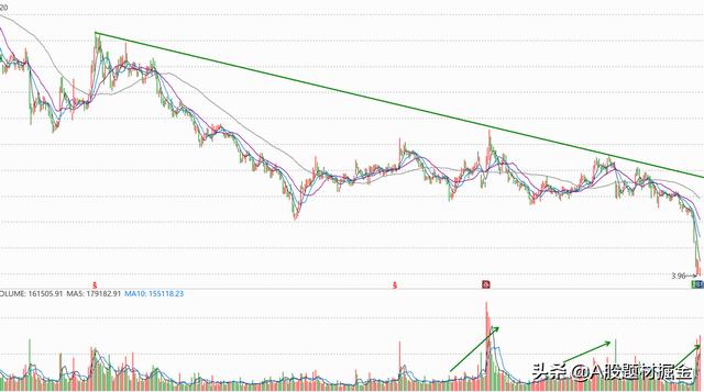 如上图所示,该股票长期以来一直处在弱势下跌的趋势中,特别是近期,股价急促下跌并止跌于3.96价位,但股价仍然处于弱势中。从近期成交量看,尤其是当前,成交量从地量迅速放大,这足以说明,股价大跌过后已经有大量的市场资金介入其中进行底仓筹码收集。为此,我们制定的交易策略为,在当前价位附近逢低收集部分底仓筹码,等待股价放量突破上方绿色下降趋势线再进行加仓操作。