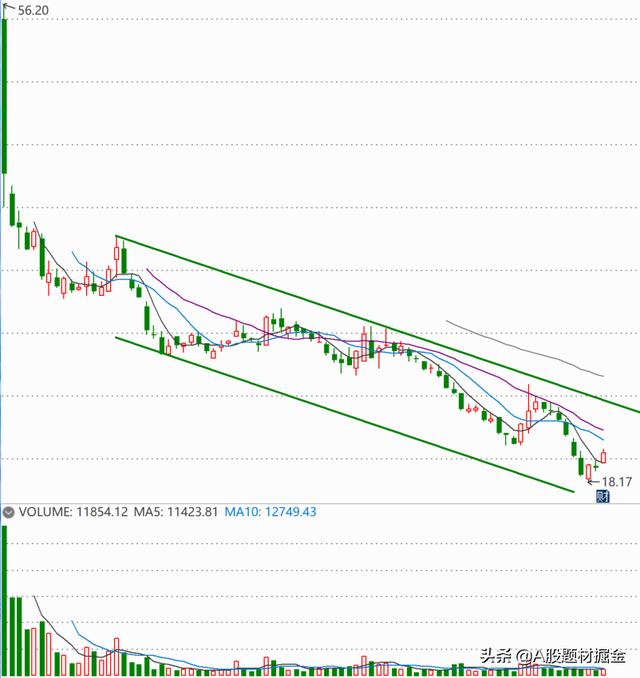 如图所示,该股为一只次新股,从上市的第一个交易日开始九一路下跌至今。目前股价处在下降通道中运行,且一路跌至通道下轨支撑线附近18.17,这也是当前该股的历史最低位。为此,我们制定的交易计划是,等待股价再次回调并在18.17价位与通道下轨支撑线附近收集部分底仓仓位,然后等待股价放量突破上轨压力线再对该股进行加仓操作。如果股价并没有回调而直接上破上轨压力线,我们可以采取直接介入的策略。