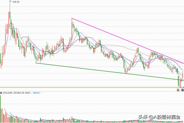 如上图所示,该股为一只次新股,目前股价跌破历史新低后出现一波小反弹。对此我们的交易策略是,等待股价再次回调,并在绿色趋势线与黄色水平线区间进行一部分底部筹码收集,随后等待股价放量突破上方粉色下降趋势线(压力线)再进行加仓操作。如果股份并不进行回调,而直接突破粉色下降趋势线,我们可以采取直接介入进行操作。