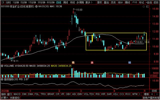 从走势上看,紫金矿业,目前横盘整理阶段的上边界,就是它的阻力区域,而下边界就是它的支撑区域。