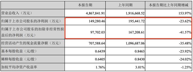今年一季度的营业收入486.78亿元,同比增长153.97%;但一季度的净利润为14.93亿元,同比下滑超23.6%,扣非净利润更是不足10亿元,同比暴跌超41%。