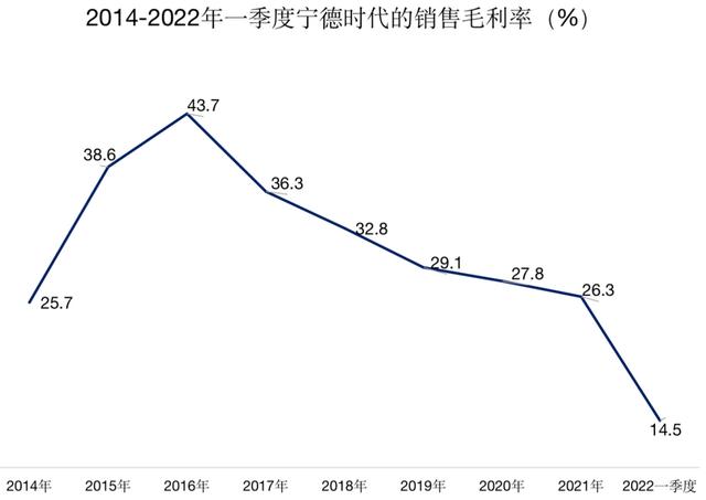 这一点,从宁德时代披露的销售毛利率也可以得到验证。今年一季度,宁德时代的销售毛利率仅有14.48%,首次跌破20%,创出历史新低。而在此前,宁德时代的毛利率常年维持在30%以上。