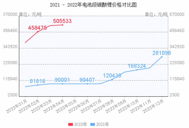 涨价最疯狂的是,电池级碳酸锂的价格。据生意社的数据显示,2022年3月电池级碳酸锂均价一度突破50万元/吨,甚至触及52万/吨的高位,相比年初,国内电池级碳酸锂价格的涨幅一度超67%,相比2021年同期的累计涨幅超过500%。