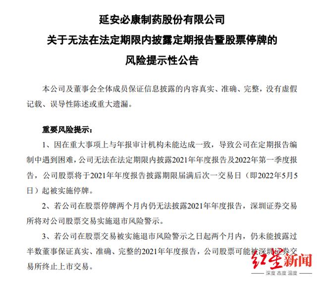 4月29日晚,延安必康公告称,因在重大事项上与年报审计机构未能达成一致,导致公司在定期报告编制中遇到困难,公司无法在法定期限内披露2021年年度报告及2022年第一季度报告。公司股票将于2021年年度报告披露期限届满后次一交易日起被实施停牌。