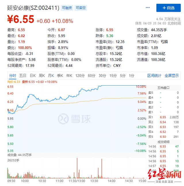 值得注意的是,就在宣布停牌的同一天,延安必康的十大股东之一周新基宣布减持公司股票不超过1532万股,即不超过公司总股本的1%。而在4月29日,延安必康涨停!报6.55元,市值100.36亿元。