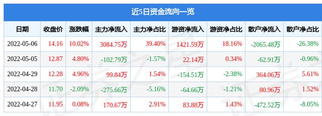 资金流向数据方面,5月6日主力资金净流入3084.75万元,游资资金净流入1421.59万元,散户资金净流出2065.48万元。