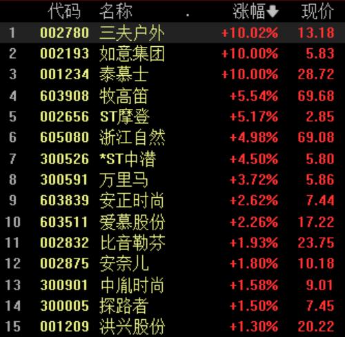 三夫户外、泰慕士、牧高笛等涨停,华纺股份、安正时尚、浙江自然等集体冲高。