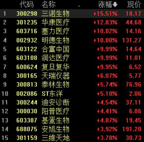 塞力医疗、明德生物涨停,三诺生物涨超15%,合富中国、之江生物等跟涨。