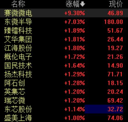 赛微微电涨超9%,东微半导、爱华集团、江海股份等跟涨。思瑞浦、华天科技、富瀚微、鹏鼎股份、晶方科技等多股下跌。