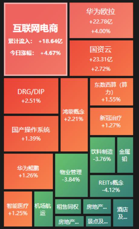 板块方面,互联网电商、国产软件、新冠检测等板块上涨,酒店、旅游、房地产等板块跌幅居前,锂光芯军表现低迷。