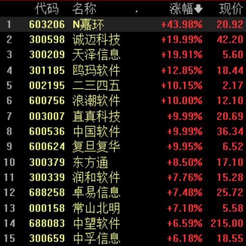 鸥玛软件、凯淳股份、诚迈科技、中国软件、浪潮软件等十余股封板,东方通、润和软件、科蓝软件、宝兰德、金山办公等大涨超10%。