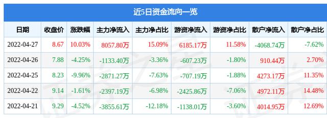 资金流向数据方面,4月27日主力资金净流入8057.8万元,游资资金净流入6185.17万元,散户资金净流出4068.74万元。