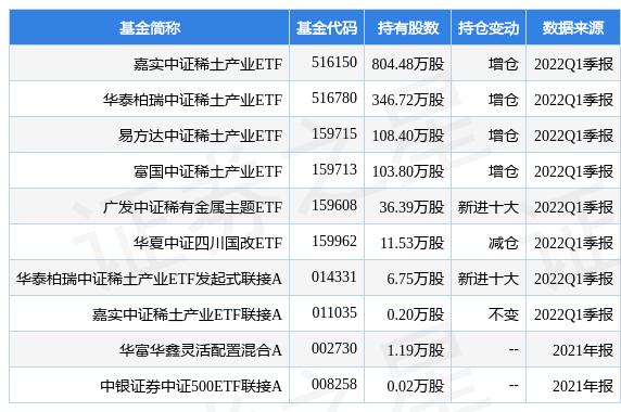 根据2022Q1季报基金重仓股数据,重仓该股的基金共8家,其中持有数量最多的基金为嘉实中证稀土产业ETF。嘉实中证稀土产业ETF目前规模为25.17亿元,最新净值1.0416(4月29日),较上一交易日上涨5.47%,近一年上涨12.41%。该基金现任基金经理为田光远。田光远在任的公募基金包括:嘉实恒生中国企业ETF(QDII),管理时间为2021年6月4日至今,期间收益率为-30.45%;嘉实中证软件服务ETF,管理时间为2021年6月4日至今,期间收益率为-33.73%;嘉实中证科创创业50ETF,管理时间为2021年6月25日至今,期间收益率为-41.07%。